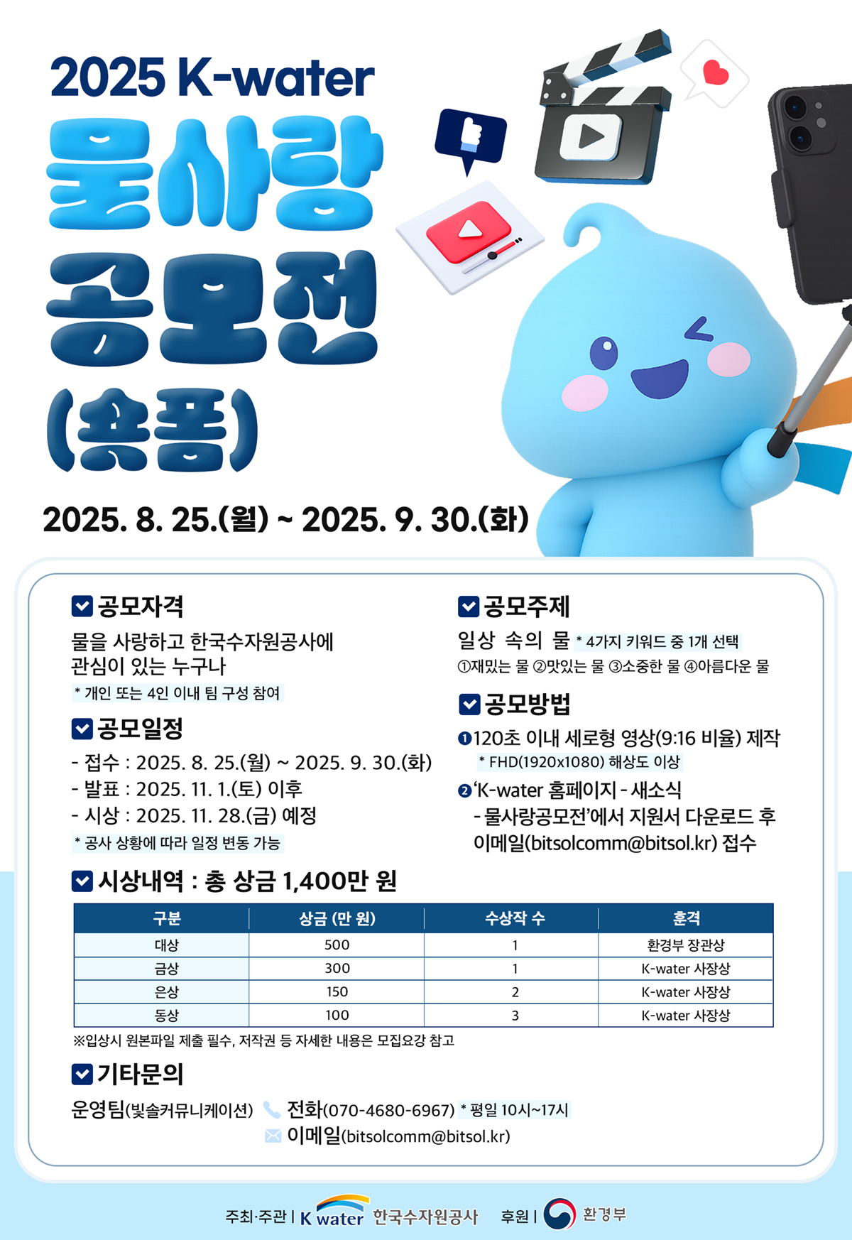 시상내역 : 총 상금 1,400만원 : (표) (구분)대상/(상금(만 원))500/(수상작 수)1/(훈격)환경부 장관상/(구분)금상/(상금(만 원))300/(수상작 수)1/(훈격)K-water 사장상/(구분)은상/(상금(만 원))150/(수상작 수)2/(훈격)K-water 사장상/(구분)동상/(상금(만 원))100/(수상작 수)3/(훈격)K-water 사장상 *입상시 원본파일 제출 필수, 저작권 등 자세한 내용은 모집요강 참고